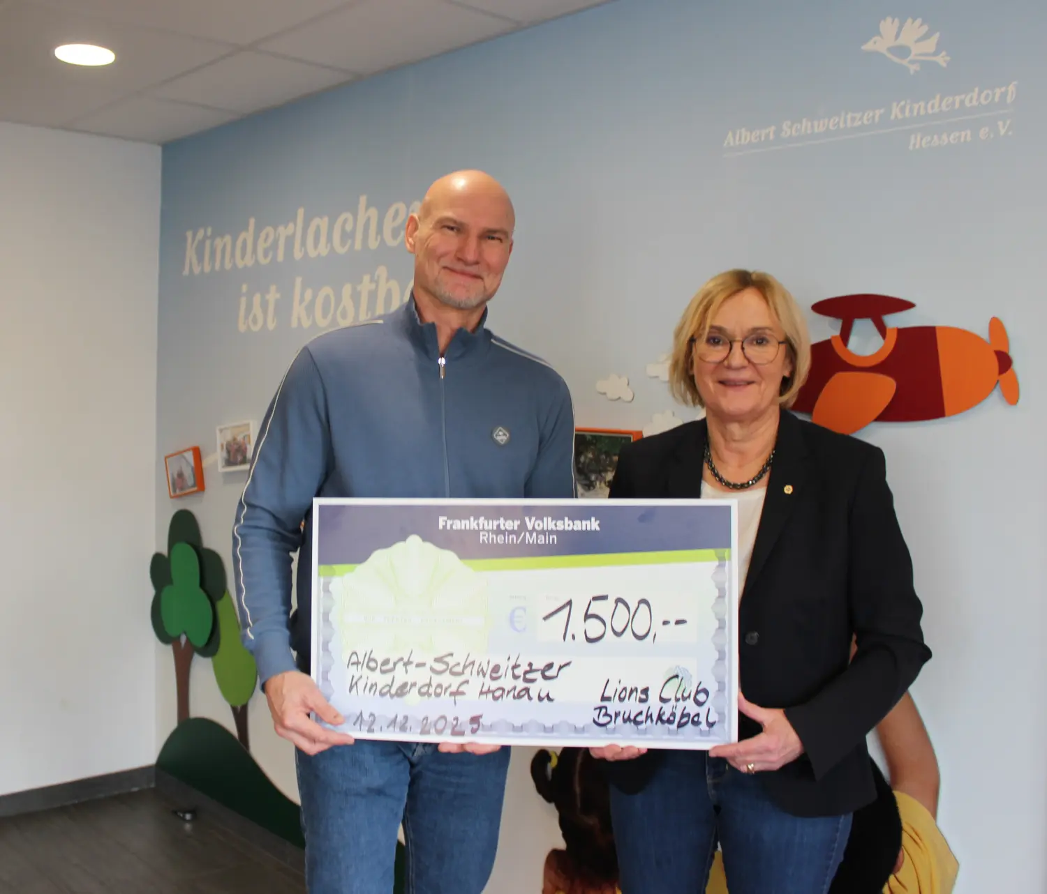 Eine Spende in Höhe von 1500 Euro hat jetzt die Bruchköbeler Lions Präsidentin Christine Lassen an Dominik Melzig vom Albert-Schweitzer-Kinderdorf Hanau übergeben. Die Einrichtung bietet Kindern und Jugendlichen in Familien- und Wohngruppen gute Entwicklungsmöglichkeiten durch familienanaloge Strukturen. In den Gruppen leben Kinder und Jugendliche mit Missbrauchs- und Gewalterfahrungen, Kinder und Jugendliche, die entwicklungsbedingt ein hohes Maß an Beziehungskontinuität und Geborgenheit benötigen und deren Herkunftsfamilien besondere Anforderungen an die Zusammenarbeit stellen.