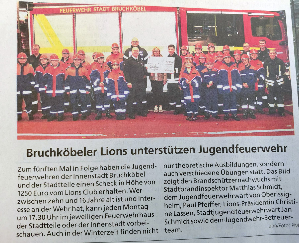 Zum fünften Mal in Folge haben die Jugendfeuerwehren der Innenstadt Bruchköbel und der Stadtteile einen Scheck in Höhe von 1250 Euro vom Lions Club erhalten. Wer zwischen zehn und 16 Jahre alt ist und Interesse an der Wehr hat, kann jeden Montag um 17.30 Uhr im jeweiligen Feuerwehrhaus der Stadtteile oder der Innenstadt vorbei-schauen. Auch in der Winterzeit finden nicht nur theoretische Ausbildungen, sondern auch verschiedene Übungen statt. Das Bild zeigt den Brandschützernachwuchs mit Stadtbrandinspektor Matthias Schmidt, dem Jugendfeuerwehrwart von Oberissigheim, Paul Pfeiffer, Lions-Präsidentin Christi-ne Lassen, Stadtjugendfeuerwehrwart Jan Schmidt sowie dem Jugendwehr-Betreuerteam.