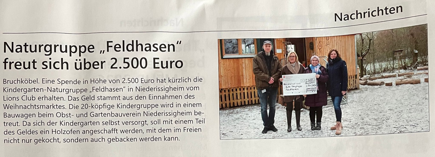 Bruchköbel. Eine Spende in Höhe von 2.500 Euro hat kürzlich die Kindergarten-Naturgruppe „Feldhasen" in Niederissigheim vom Lions Club erhalten. Das Geld stammt aus den Einnahmen des Weihnachtsmarktes. Die 20-köpfige Kindergruppe wird in einem Bauwagen beim Obst- und Gartenbauverein Niederissigheim be-treut. Da sich der Kindergarten selbst versorgt, soll mit einem Teil des Geldes ein Holzofen angeschafft werden, mit dem im Freien nicht nur gekocht, sondern auch gebacken werden kann.